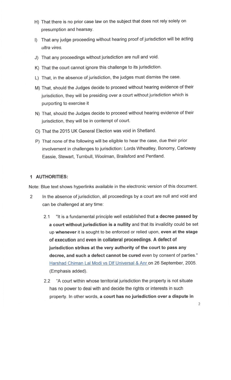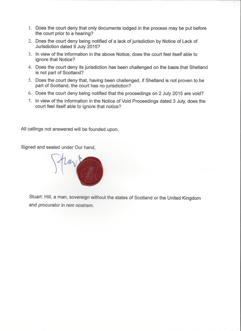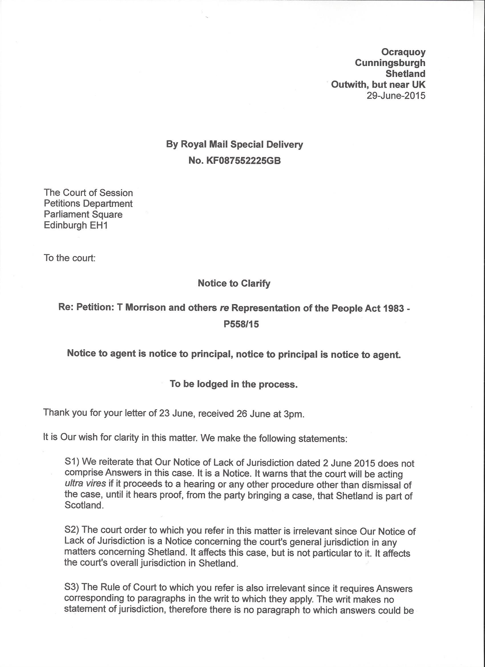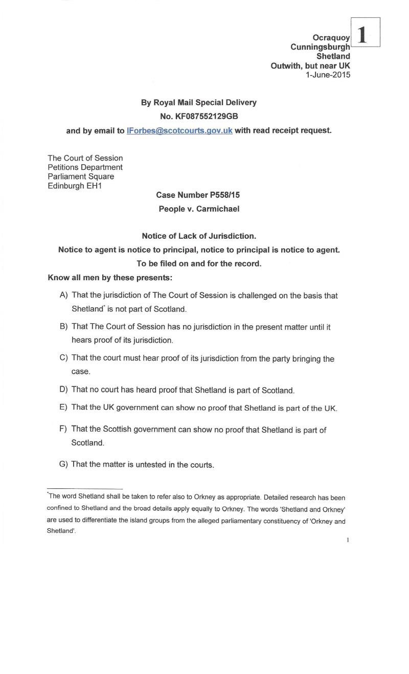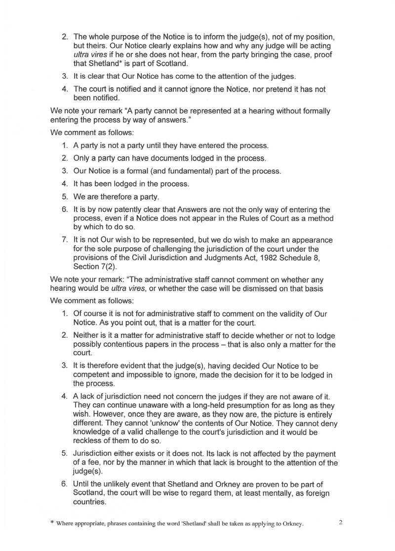 - S1) We reiterate that Our Notice of Lack of Jurisdiction dated 2 June 2015 does not comprise Answers in this case. It is a Notice. It warns that the court will be acting ultra vires if it proceeds to a hearing or any other procedure other than dismissal of the case, until it hears proof, from the party bringing a case, that Shetland is part of Scotland.