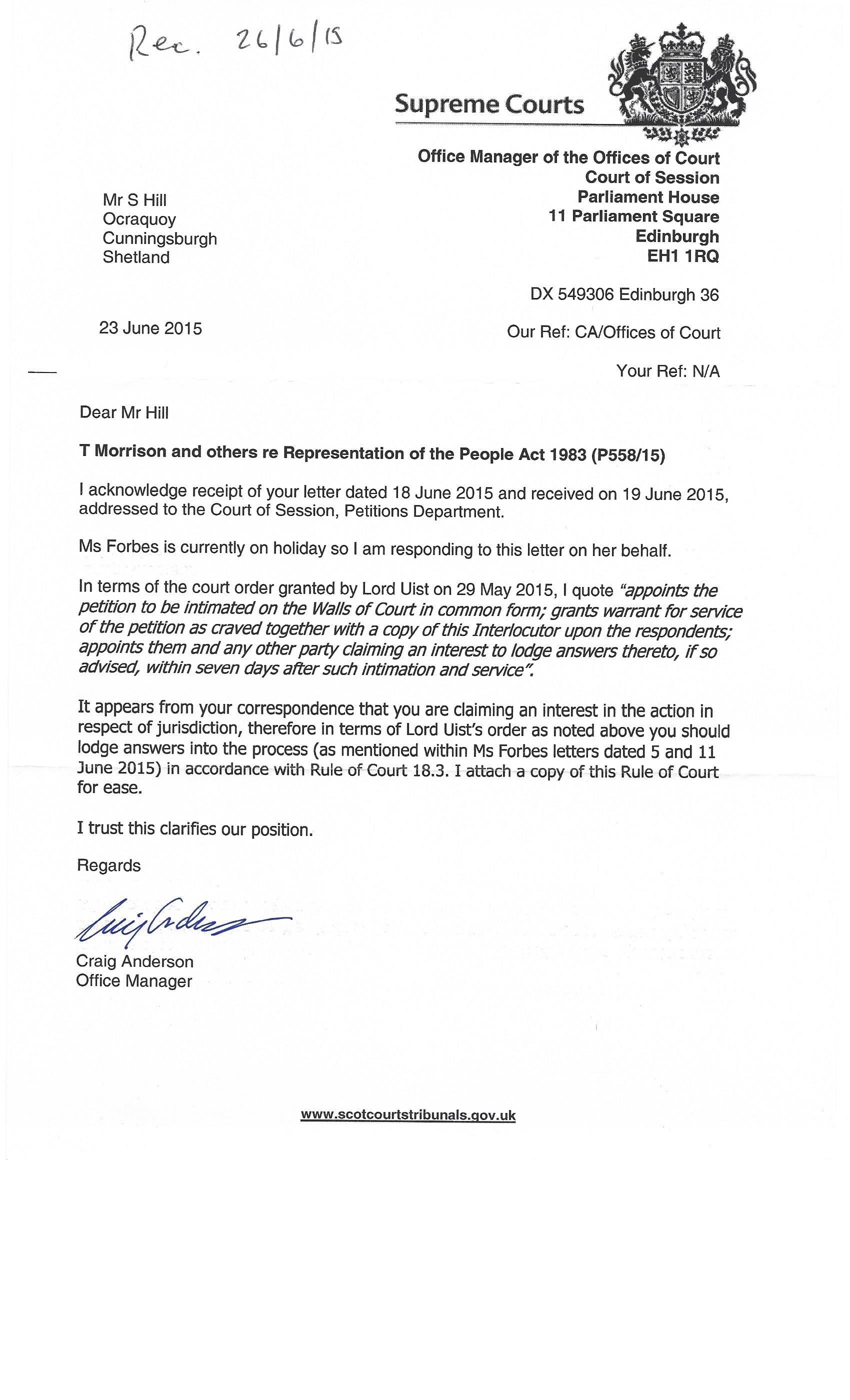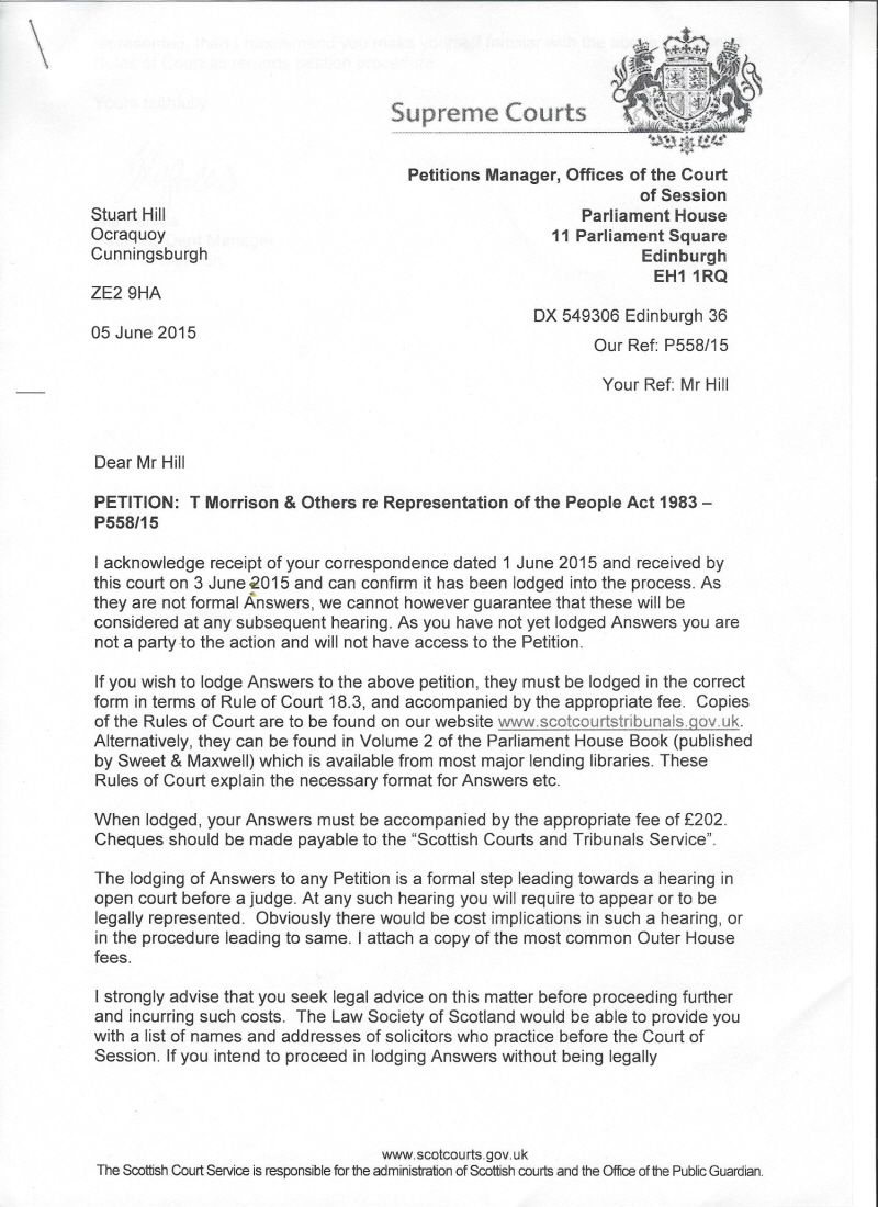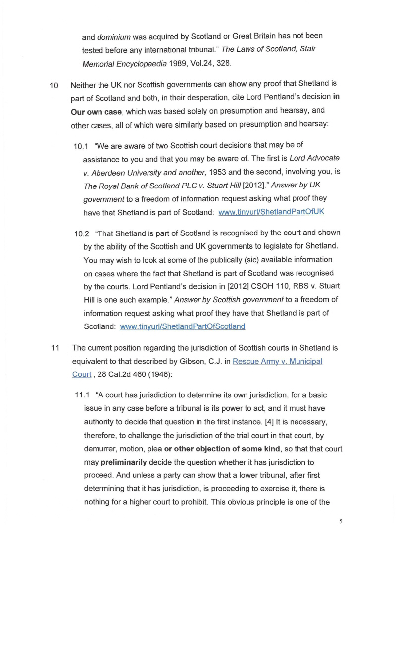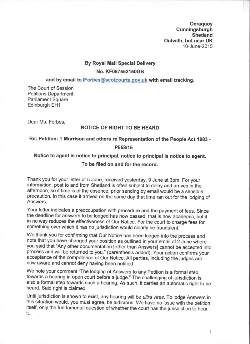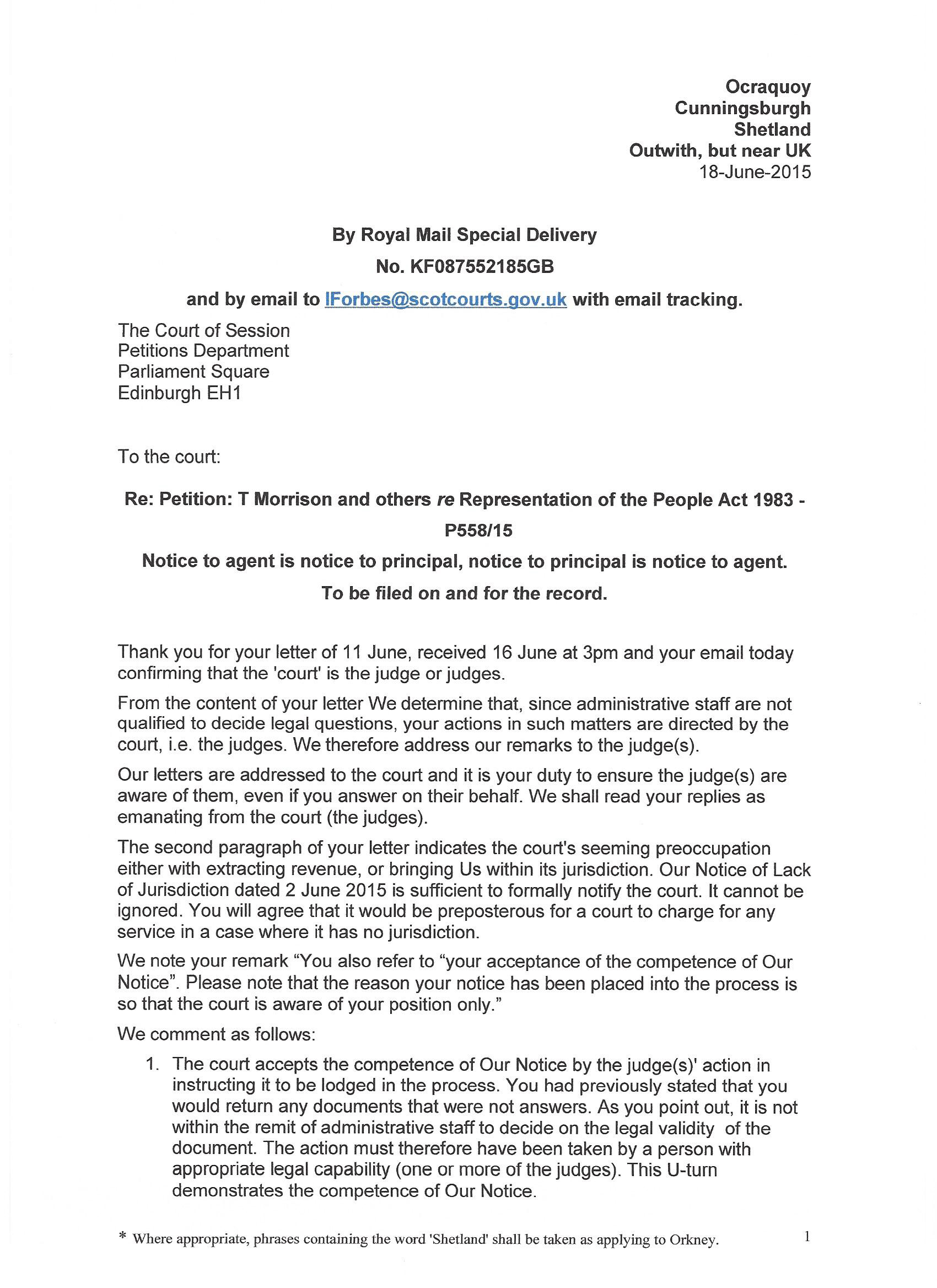 - S1) We reiterate that Our Notice of Lack of Jurisdiction dated 2 June 2015 does not comprise Answers in this case. It is a Notice. It warns that the court will be acting ultra vires if it proceeds to a hearing or any other procedure other than dismissal of the case, until it hears proof, from the party bringing a case, that Shetland is part of Scotland.