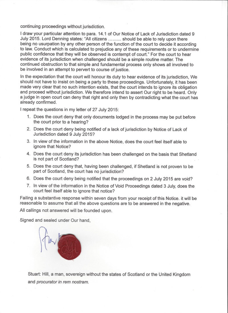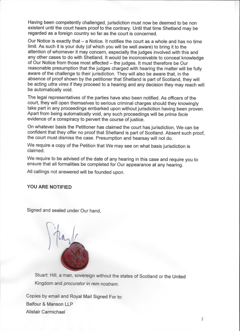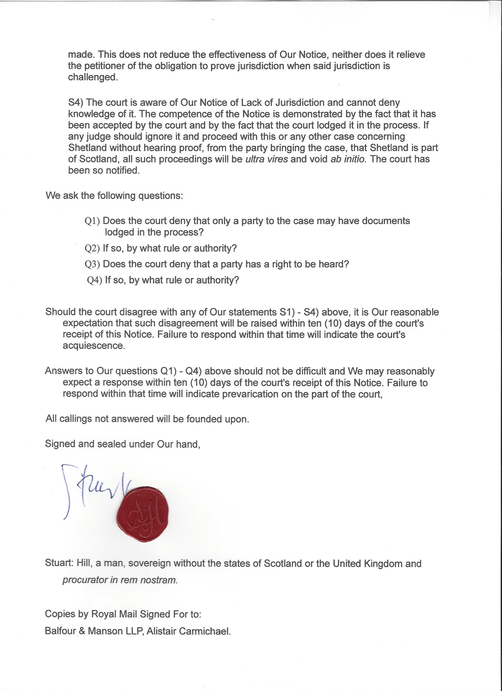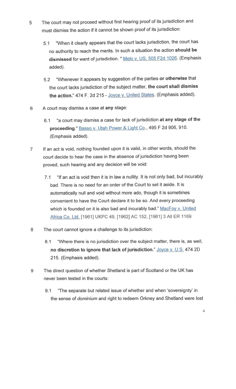 - S4) The court is aware of Our Notice of Lack of Jurisdiction and cannot deny knowledge of it. The competence of the Notice is demonstrated by the fact that it has been accepted by the court [and by the Supreme Court] and by the fact that the court lodged it in the process. If any judge should ignore it and proceed with this or any other case concerning Shetland without hearing proof, from the party bringing the case, that Shetland is part of Scotland, all such proceedings will be ultra vires and void ab initio. The court has been so notified.