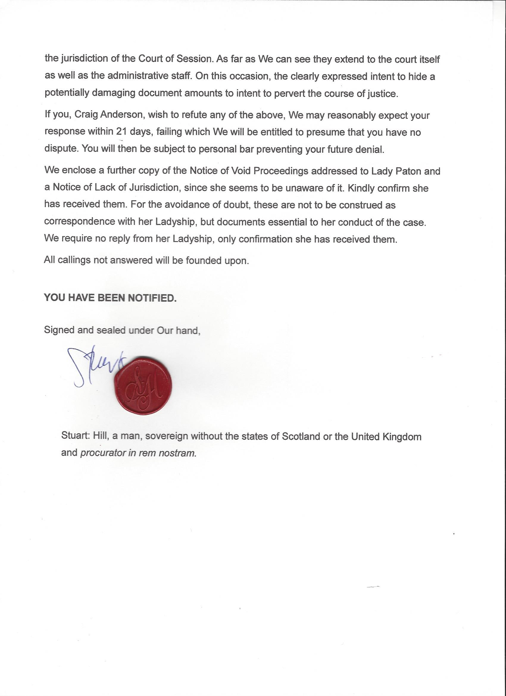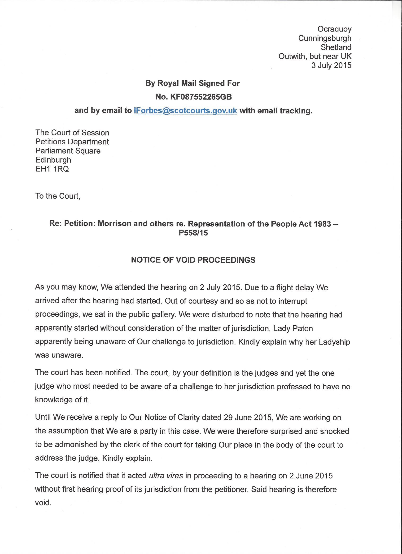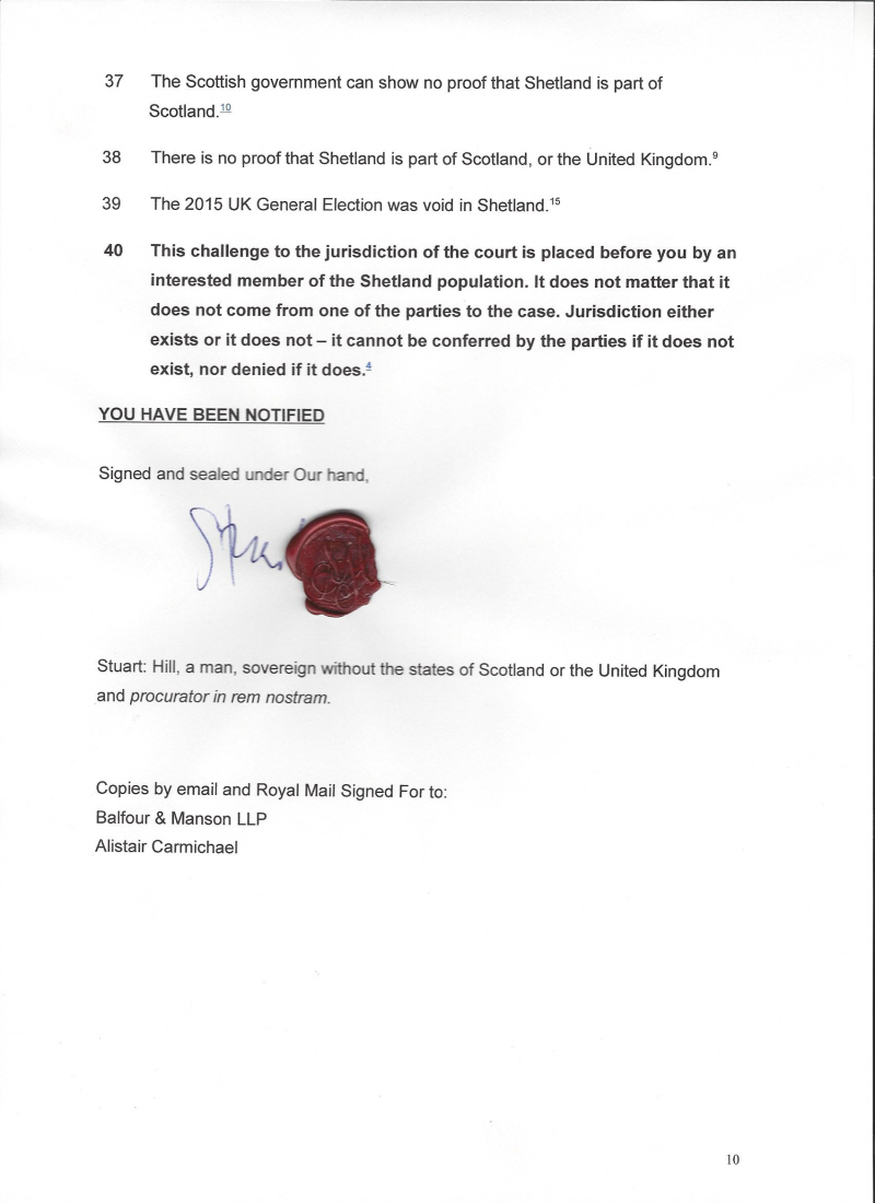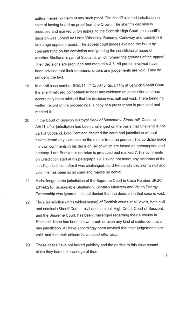 - S4) The court is aware of Our Notice of Lack of Jurisdiction and cannot deny knowledge of it. The competence of the Notice is demonstrated by the fact that it has been accepted by the court [and by the Supreme Court] and by the fact that the court lodged it in the process. If any judge should ignore it and proceed with this or any other case concerning Shetland without hearing proof, from the party bringing the case, that Shetland is part of Scotland, all such proceedings will be ultra vires and void ab initio. The court has been so notified.