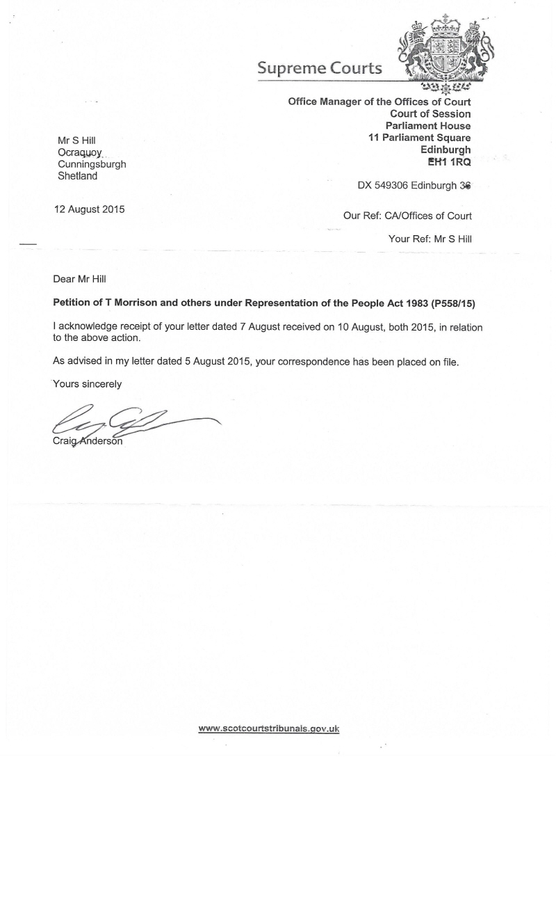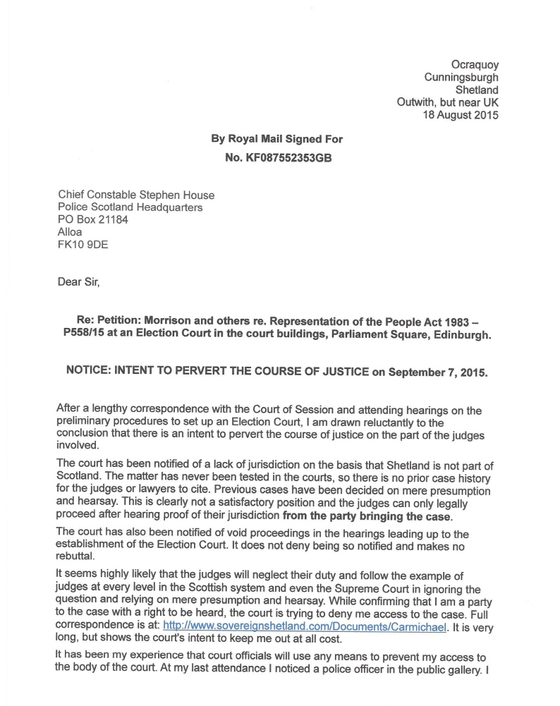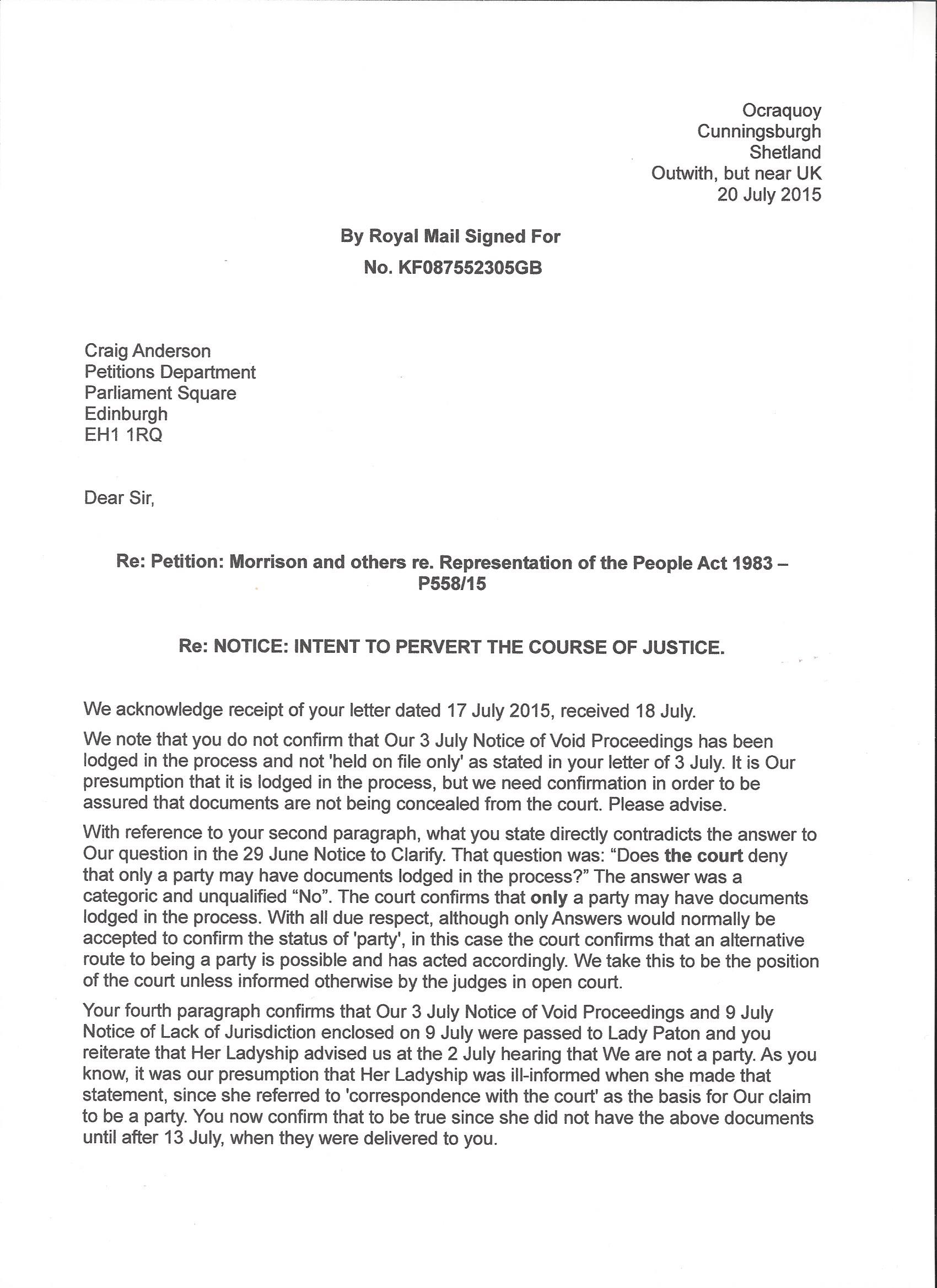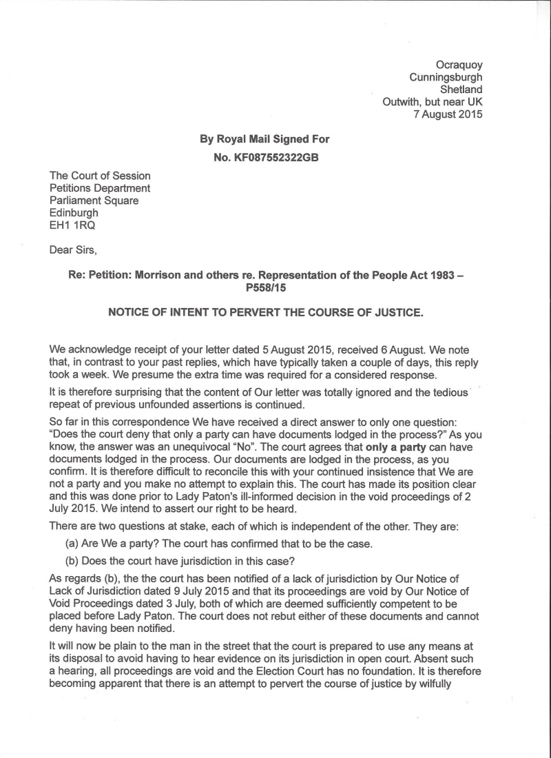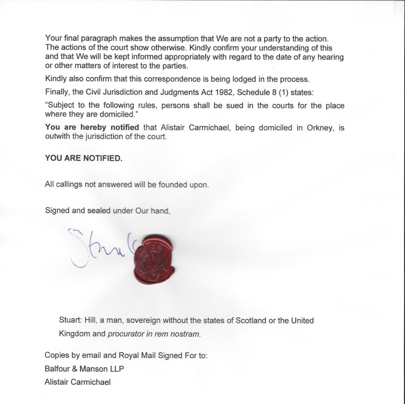- S4) The court is aware of Our Notice of Lack of Jurisdiction and cannot deny knowledge of it. The competence of the Notice is demonstrated by the fact that it has been accepted by the court [and by the Supreme Court] and by the fact that the court lodged it in the process. If any judge should ignore it and proceed with this or any other case concerning Shetland without hearing proof, from the party bringing the case, that Shetland is part of Scotland, all such proceedings will be ultra vires and void ab initio. The court has been so notified.
