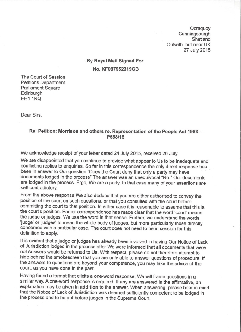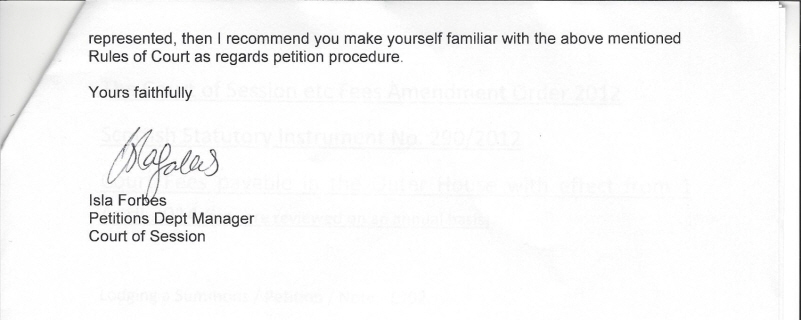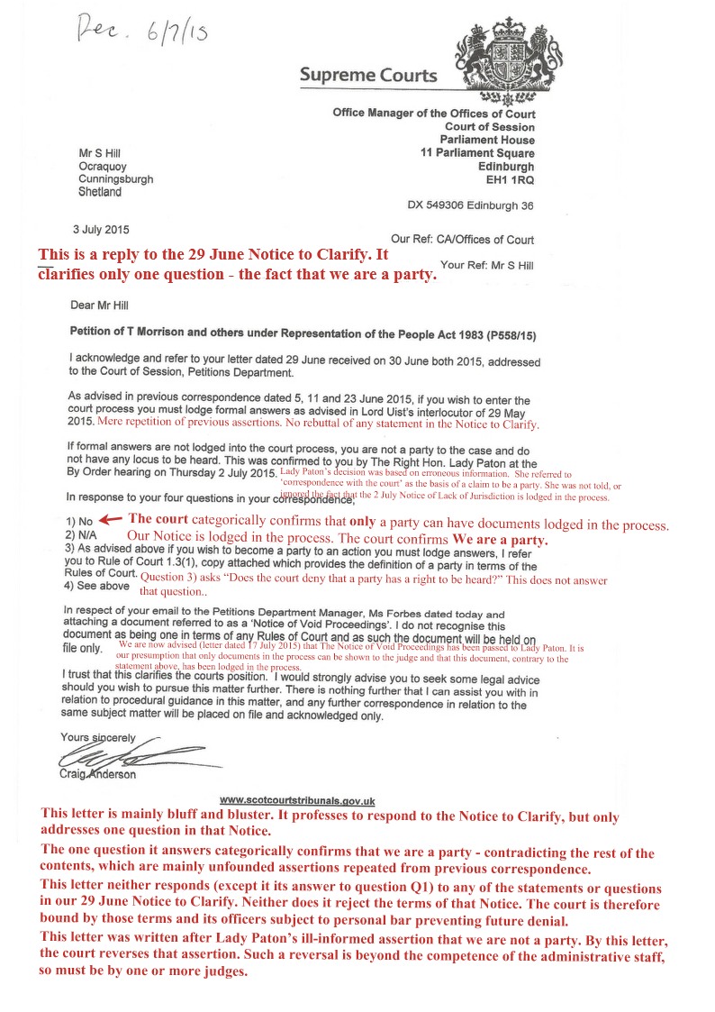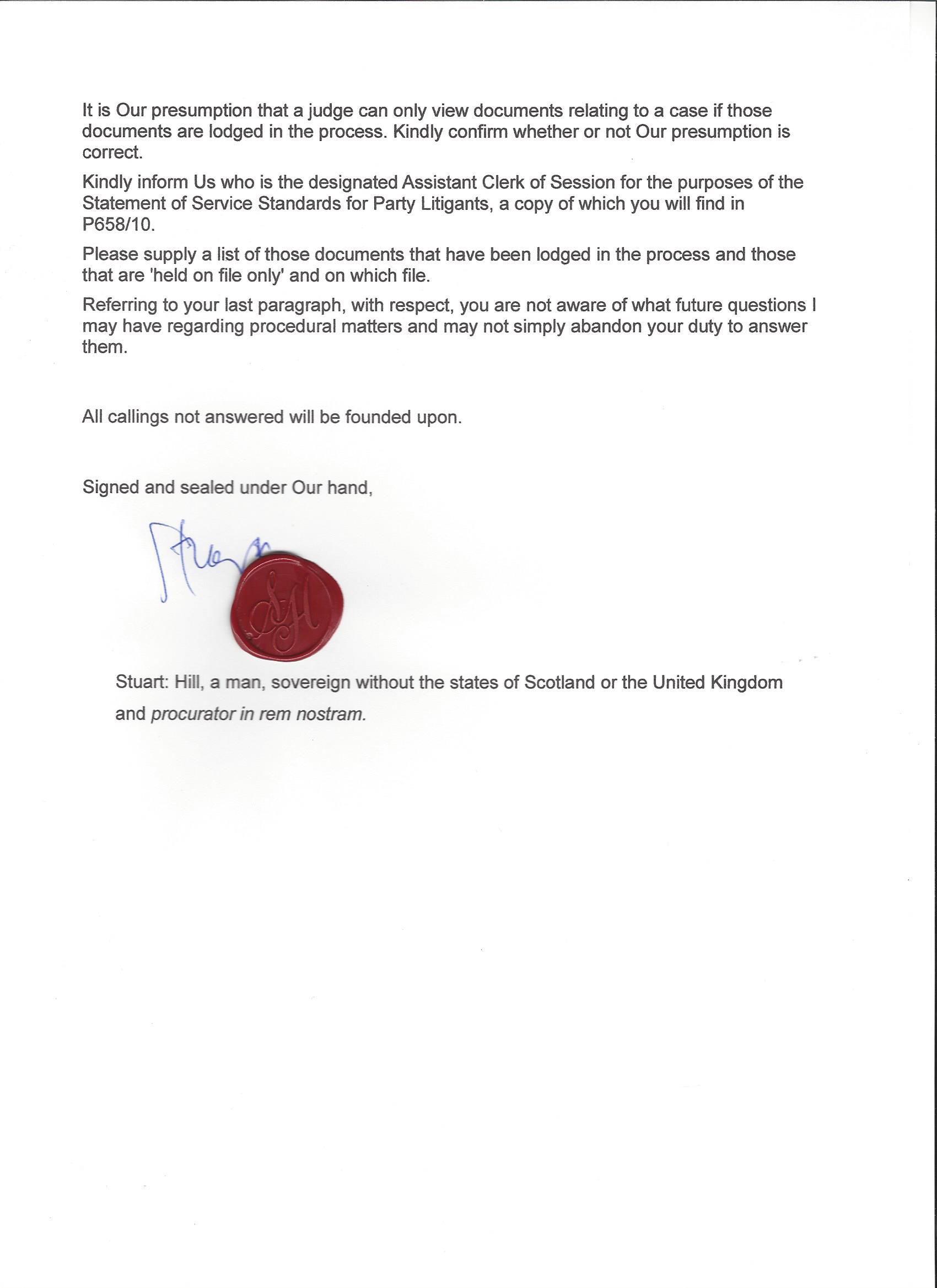 Then a most interesting reply. At first sight it looks like a complete rejection of my position. However, it is a reply to my Notice for Clarity and must be viewed in that light. It is a reply, but not a response. It does not reject the terms of the Notice for Clarity, it simply ignores them. It comes after, and therefore supercedes Lady Paton's decision The only direct answer is a categoric 'No' to the question "Does the court deny that only a party can have documents lodged in the process?" In other words, the court confirms that only a party can have documents lodged in the process. My Notice of Lack of Jurisdiction is lodged in the process, therefore I am a party and I must be heard. Everything else in the letter is bluff and bluster, simply repeating what has been been said before. By not rejecting the terms of the Notice, the court agrees with these statements: