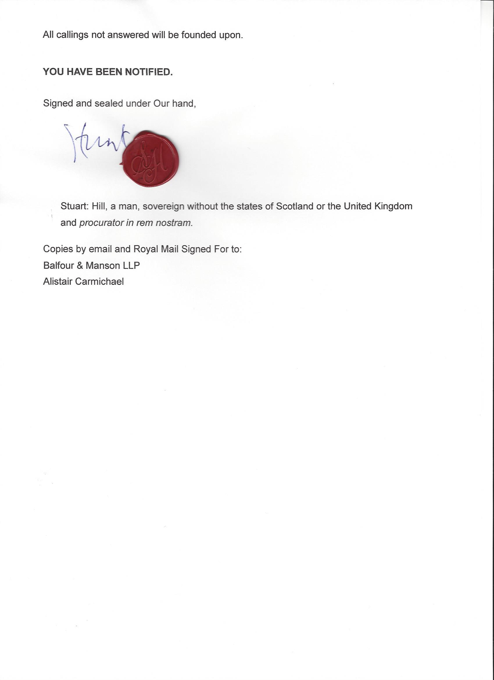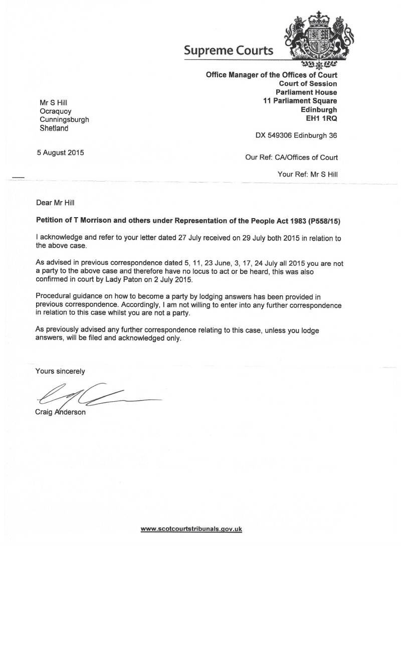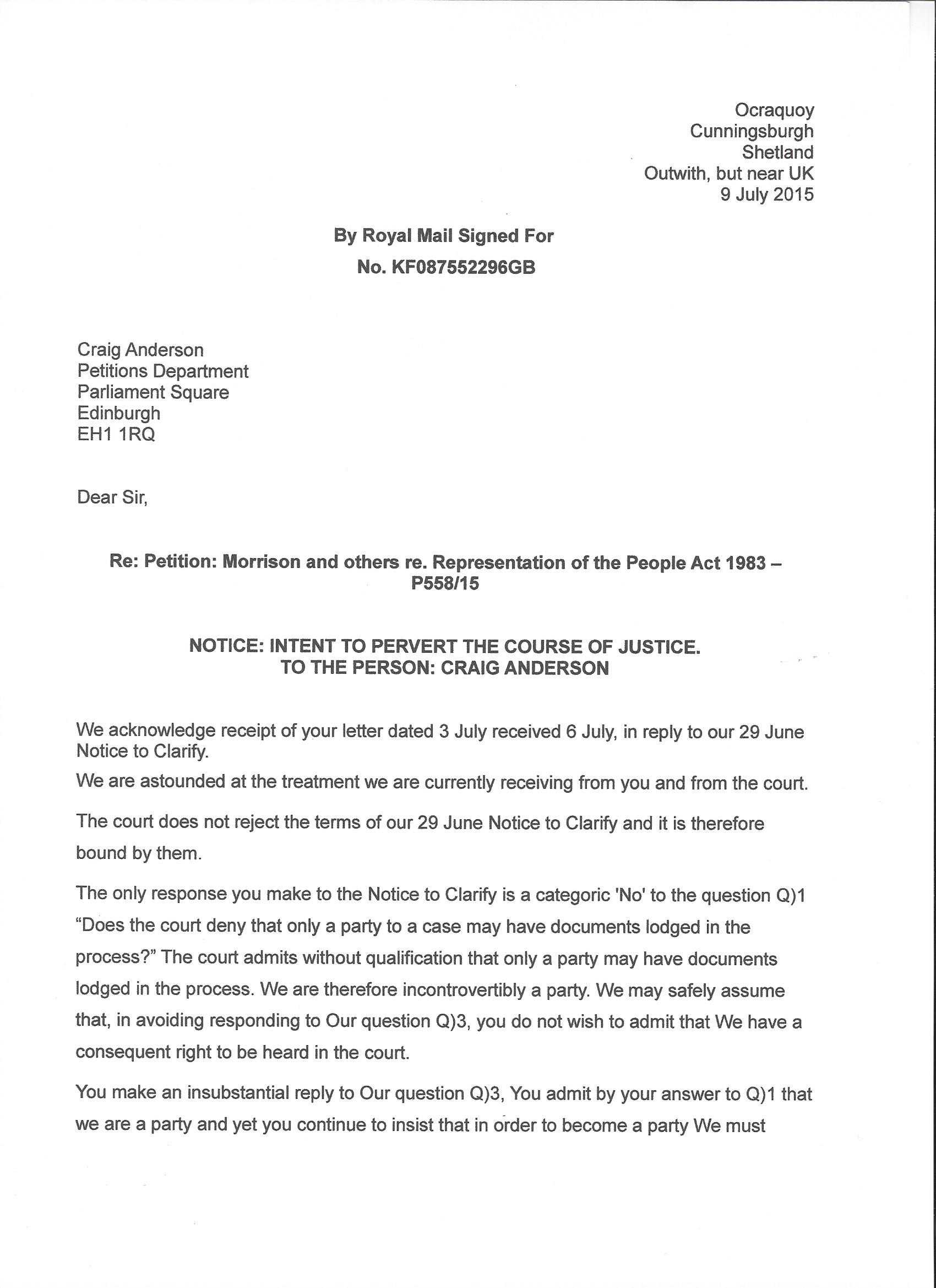 Then a most interesting reply. At first sight it looks like a complete rejection of my position. However, it is a reply to my Notice for Clarity and must be viewed in that light. It is a reply, but not a response. It does not reject the terms of the Notice for Clarity, it simply ignores them. It comes after, and therefore supercedes Lady Paton's decision The only direct answer is a categoric 'No' to the question "Does the court deny that only a party can have documents lodged in the process?" In other words, the court confirms that only a party can have documents lodged in the process. My Notice of Lack of Jurisdiction is lodged in the process, therefore I am a party and I must be heard. Everything else in the letter is bluff and bluster, simply repeating what has been been said before. By not rejecting the terms of the Notice, the court agrees with these statements: