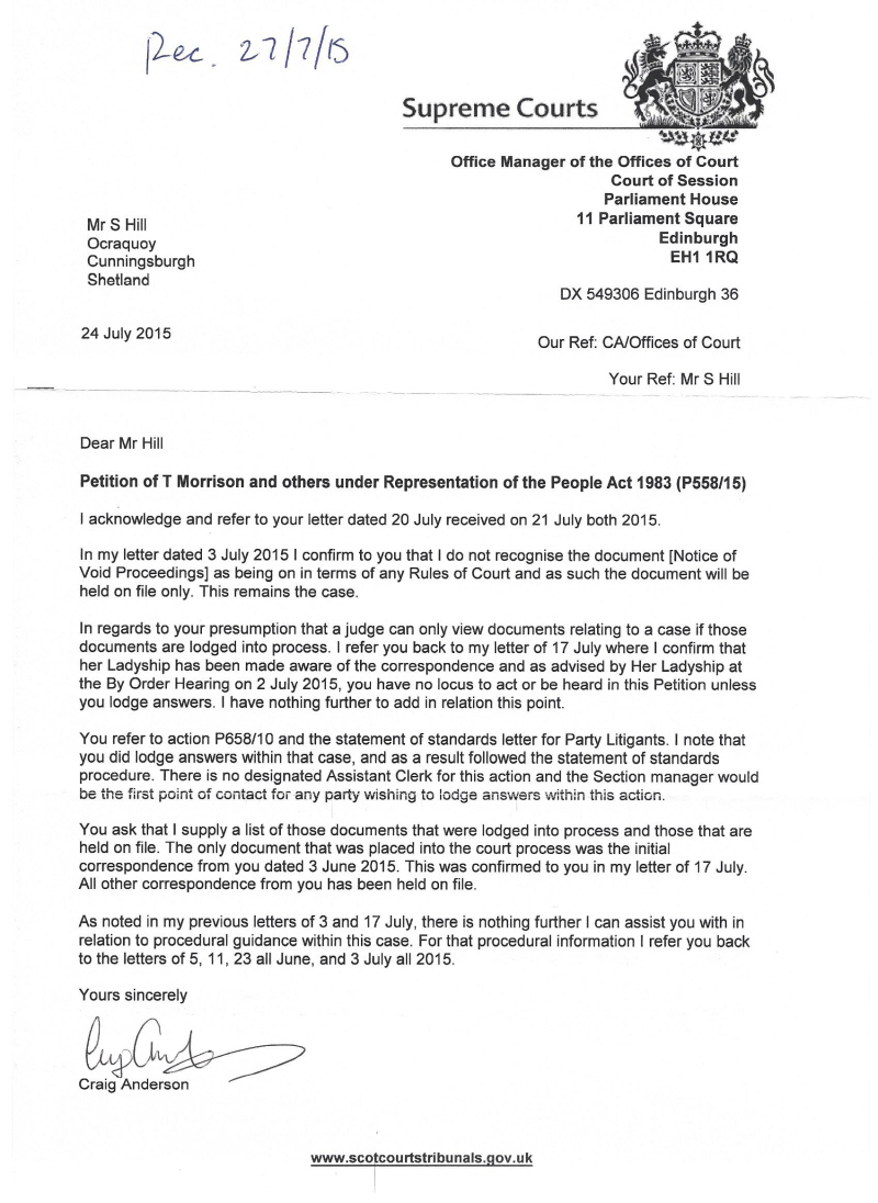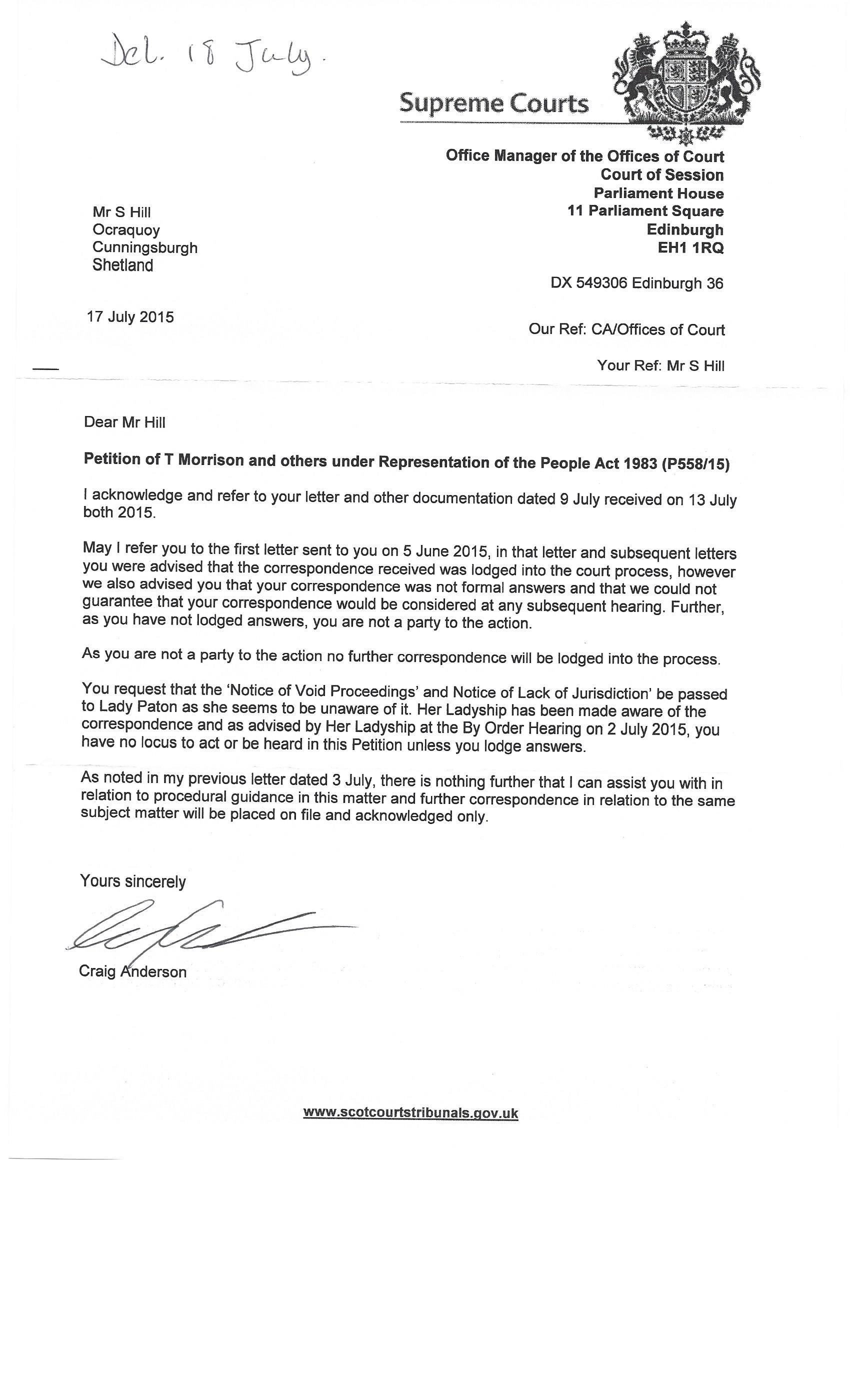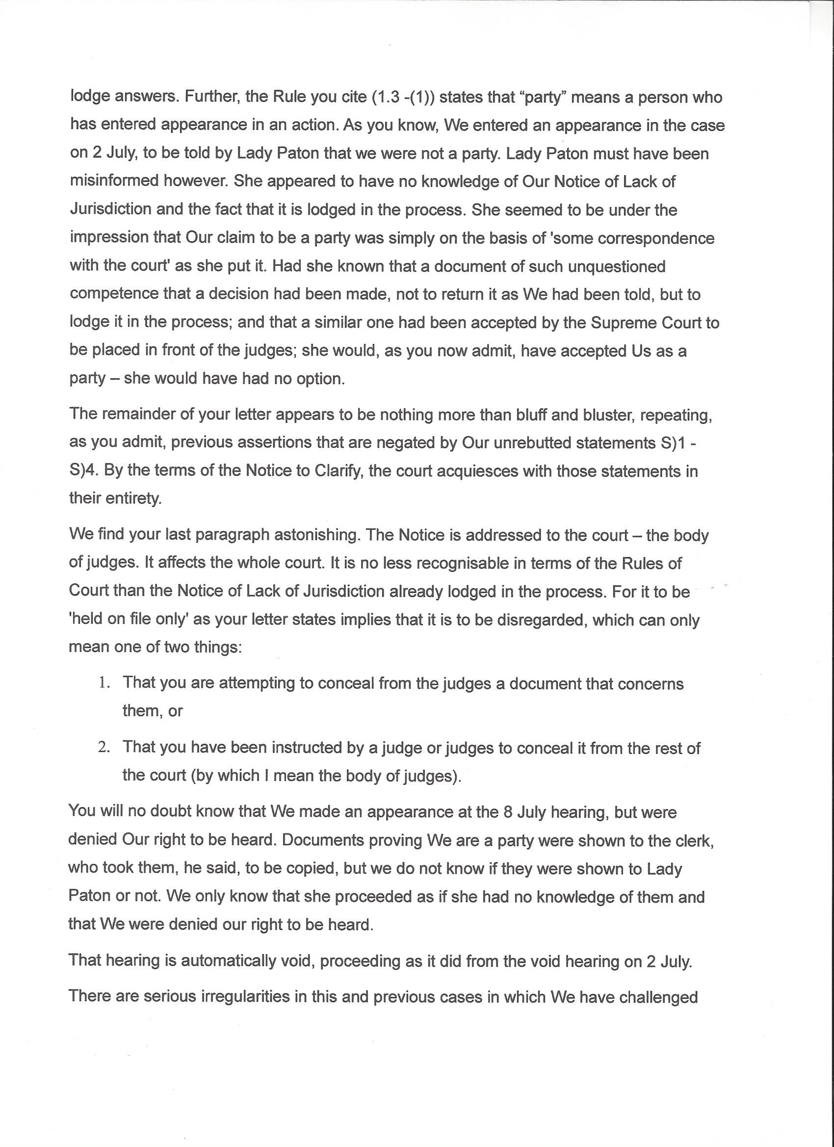 Having said they will not reply to any further letters, a reply! Still they contradict themselves by trying to insist I am not a party. However, they confirm that Lady Paton has been notified of both the court's lack of jurisdiction and the fact that the 2 July hearing was void for lack of jurisdiction. Whether I am a party or not, the judges cannot pretend they know nothing of these notices. They imply that Lady Paton advised me I was not a party on the strength of these documents, while at the same time confirming she only received them around 13 July - 11 days later! Once again the threat to make no further replies as they dig the hole deeper.