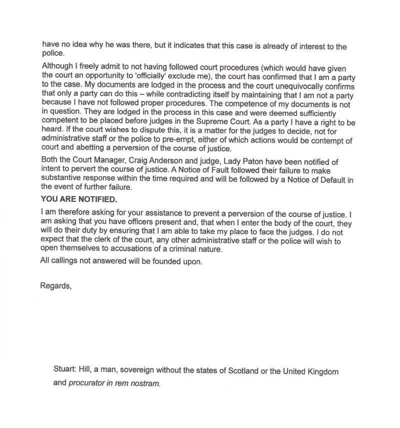The following day it was announced that a 'by order' hearing was to be held in two days time, on 2 July. Once again, generous support enabled me to fly down to Edinburgh for the hearing. The plane was delayed, so the hearing was already in progress when I got there. Out of courtesy, I sat in the public gallery - at the front and close to a vacant seat in the body of the court. By the fact that the proceedings were in progress was apparent that Judge Lady Paton had taken no steps to hear evidence of jurisdiction. As the hearing finished, I stepped forward to the vacant position and reminded the court that there was a challenge to its jurisdiction, that the documents were in the 'process' and that I was entitled to be heard as a party. After a quick conflab between the clerk and the judge, the judge announced I was not a party and she could not hear me. Strange acoustics in that room!
